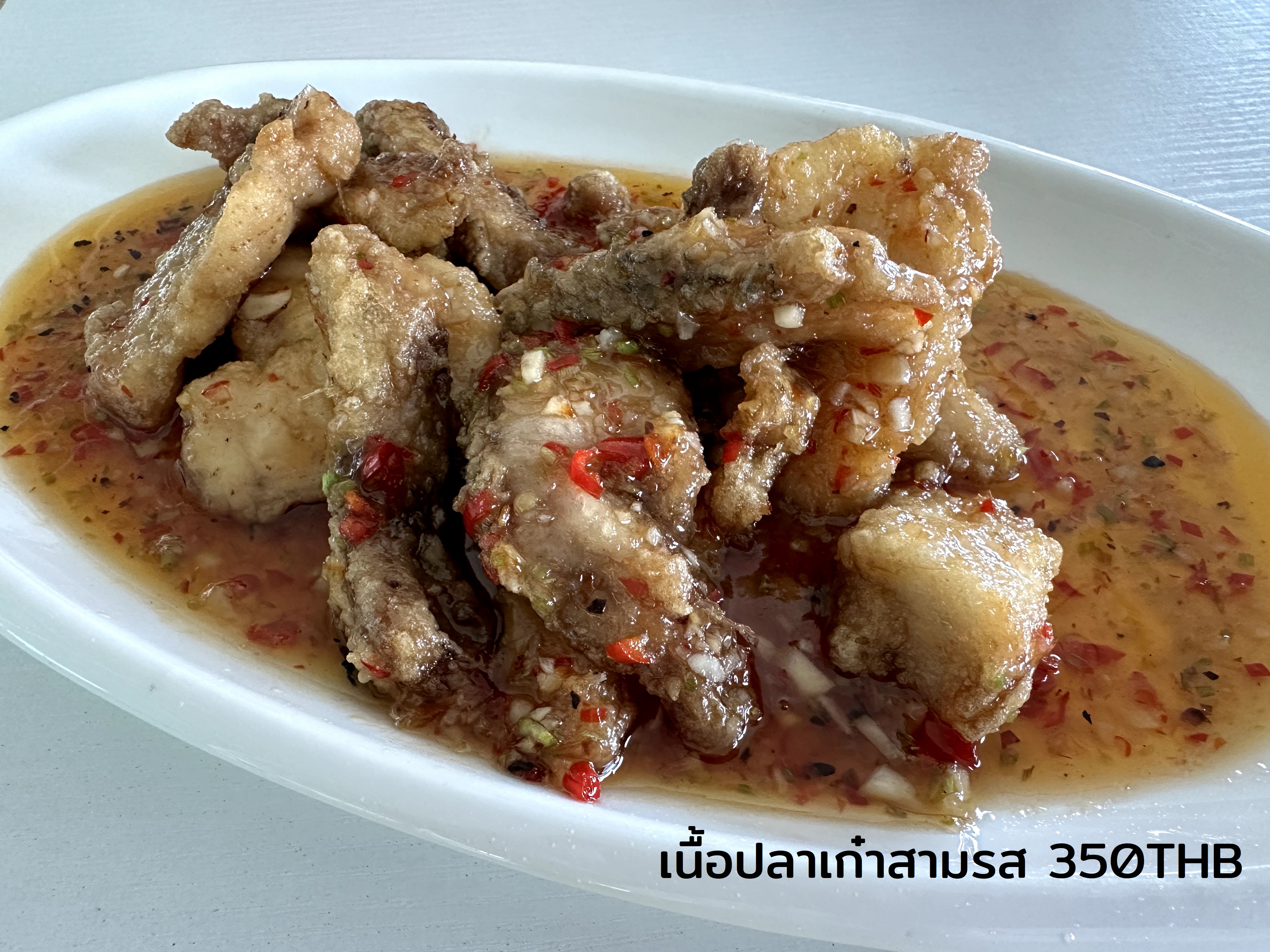 おすすめ料理(写真) ●エビの唐辛子塩炒めกุ้งทอดพริกเกลือ●ハタ三味調理เนื้อปลาเก๋าสามรส●カニ足のカレー粉炒めกรรเชียงปูผัดผงกระหรี่