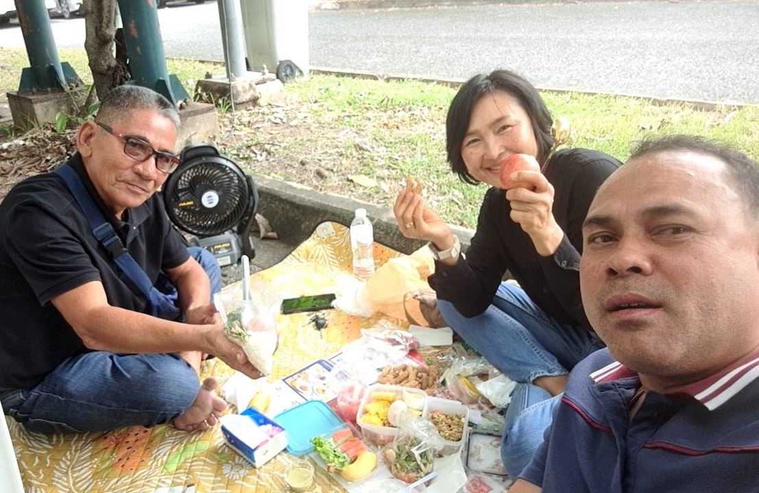 2025年10月28日(火)**フェニックスゴールドパタヤ、今年最後のスポーツデイ特価日です。ここはパタヤに最も近く、料金も手頃、整備状態よく大変人気のゴルフ場です。景色もよいです。南国リゾート感漂うゴルフ場です。 2025年10月28日(火)**運転手達は会食、一か所に数組集まる日は朝エリがお弁当作っていくことが多いです。ここで大活躍が皆様から頂いた「ふりかけ」らしいです。自粛期間ですので運転手は赤色のユニフォームではなく黒系統の服を着用しています。11月25日まで。