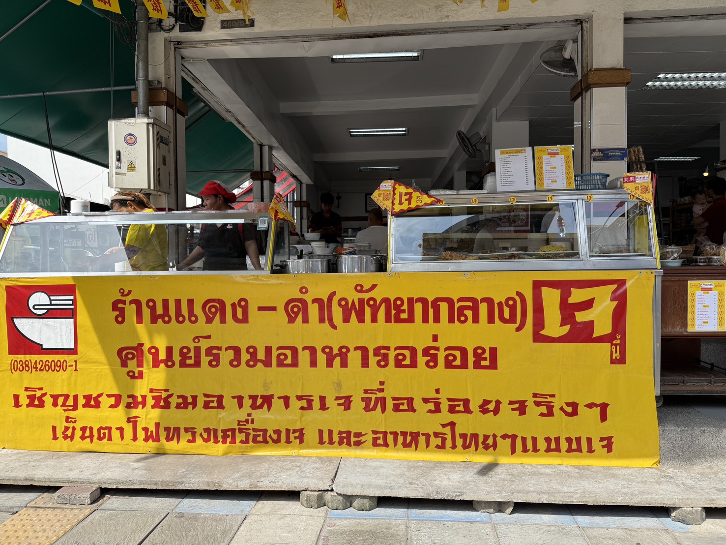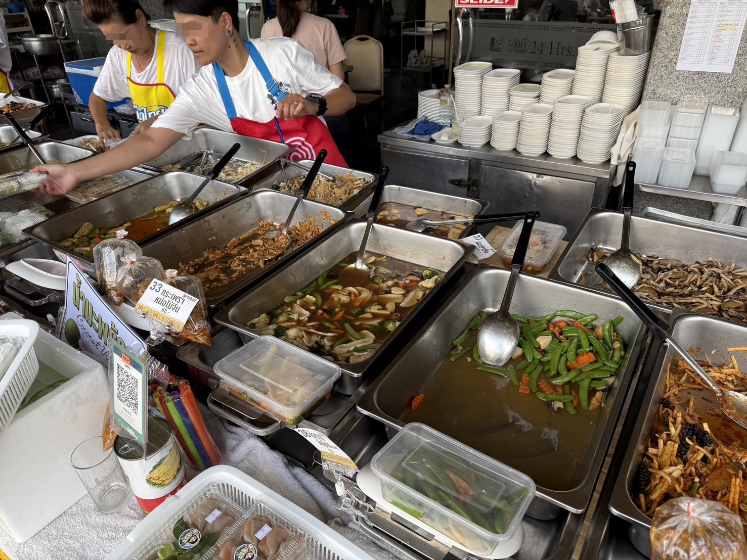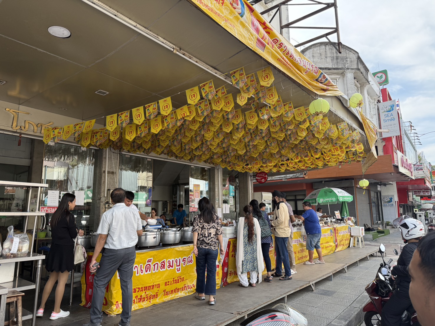 2025年10月21日(火)**菜食週間(ギンジェー)กินเจはじまりました。 レンキーなどの惣菜が有名です。街じゅうが菜食ムードに包まれる特別な9日間。黄色い「齋」旗が目印です。(写真左下)レンキー(写真右下)デンダム、いずれもセントラルパタヤ通りにあります。